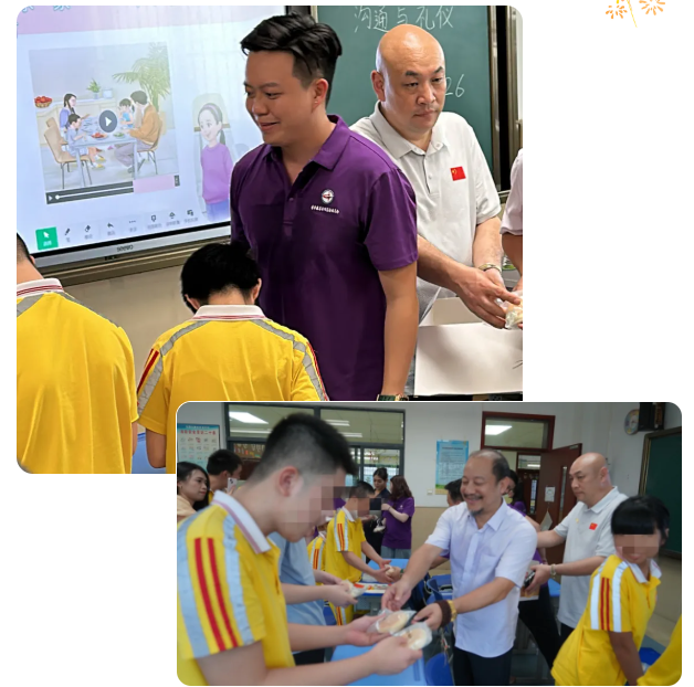 在东莞市康复实验学校,基金会、青委会代表们与学校的师生进行了温馨的交流,观摩了孩子们的教学和康复活动,对老师们长期以来的辛勤付出和无私奉献表达了崇高的敬意。香甜的月饼传递到孩子们手中,化作了一张张灿烂的笑脸,现场洋溢着欢乐祥和的节日氛围。