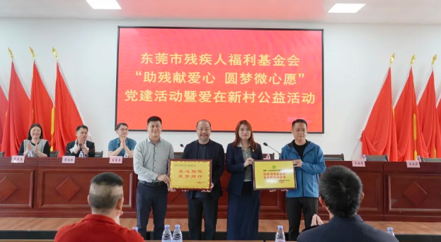 市残联二级调研员杨兴会与万江街道办事处副主任何敏斐为市残疾人福利基金会颁发爱心牌匾。